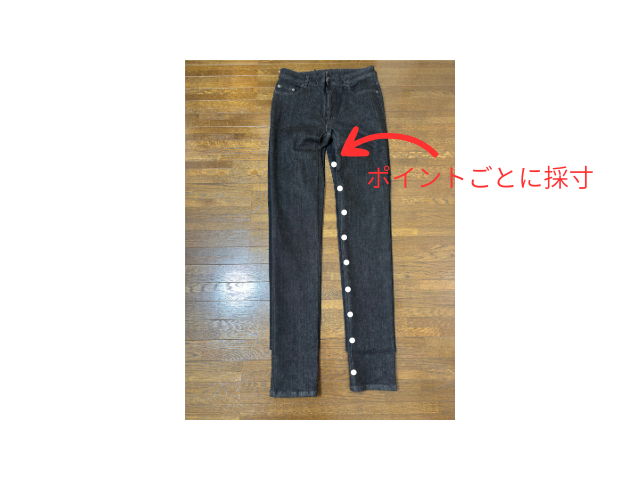 まず、見本としていただいたスキニーパンツのサイズを計測します。
