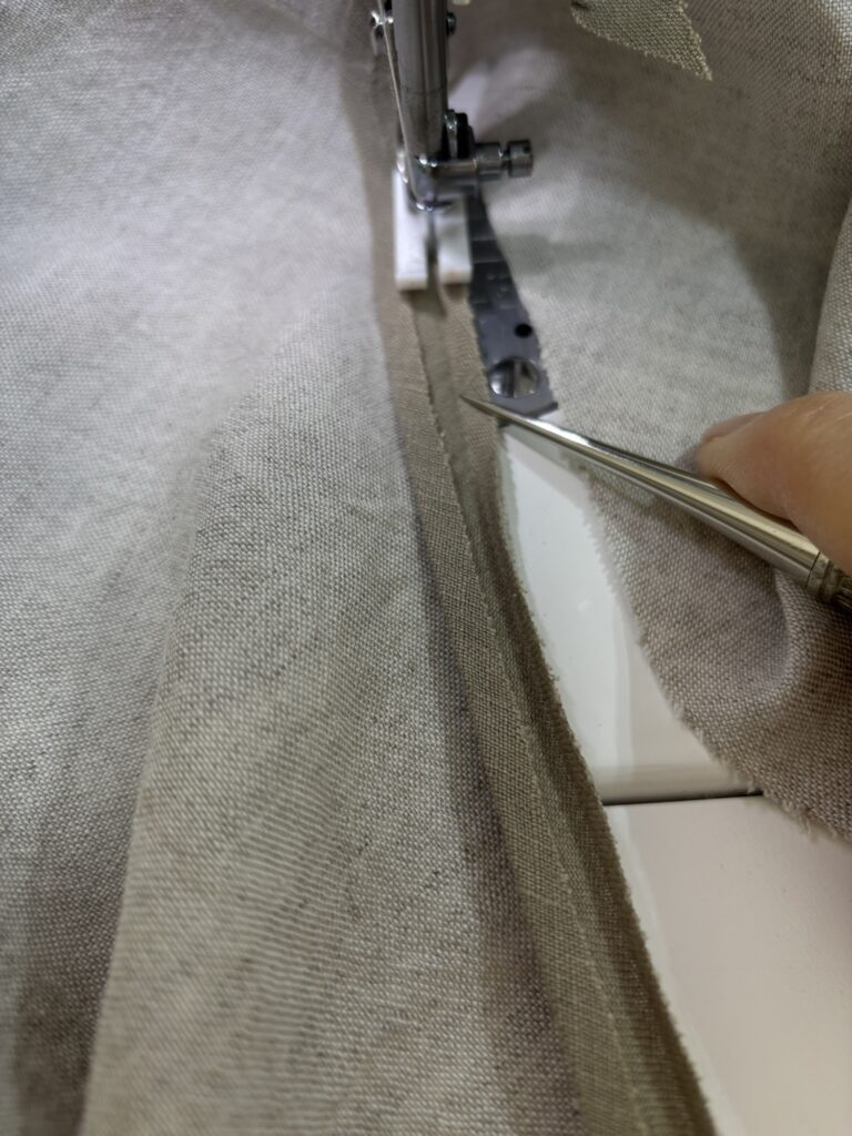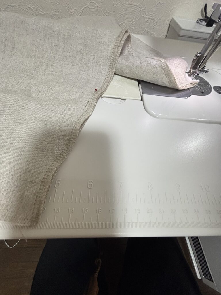 今回は、首まわりのバイアスにカーキのリネンを使ってみました。